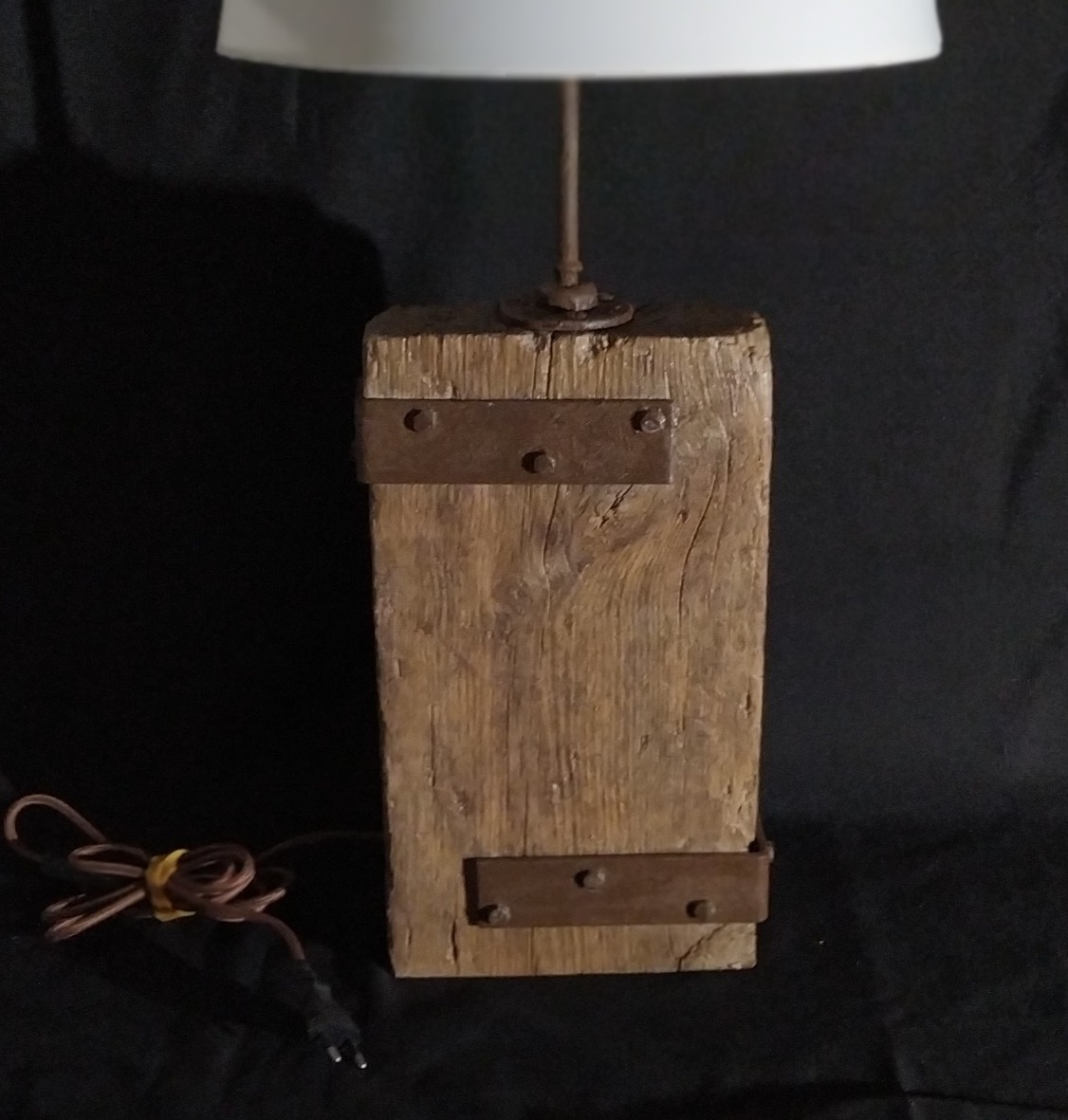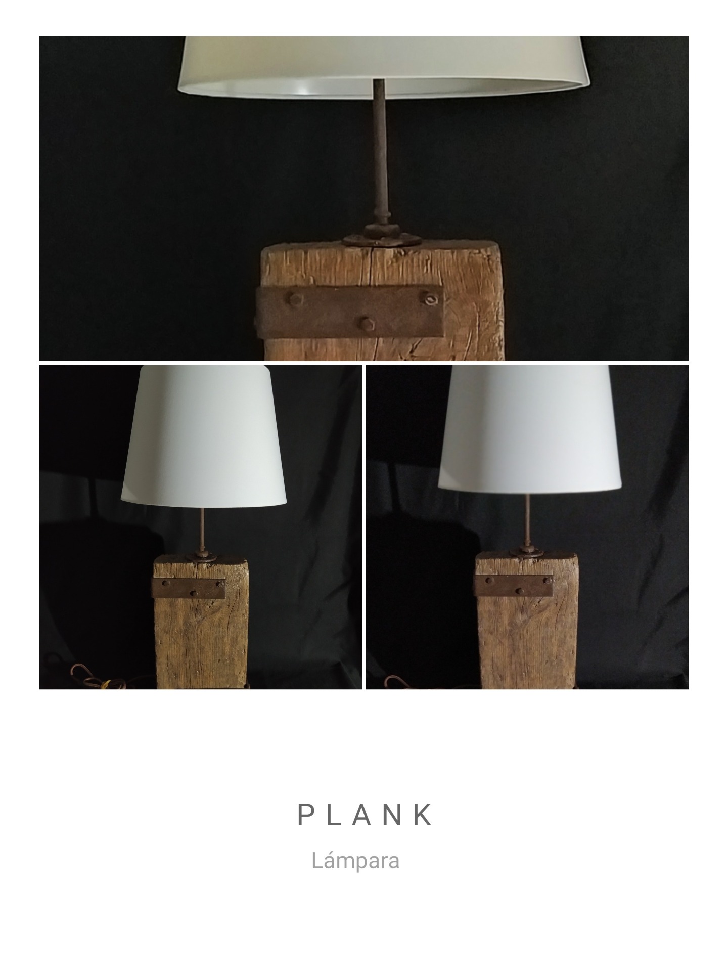 La lámpara PLANK esta hecha con parte de un antiguo tablón de obra, curtido por el paso del tiempo en el exterior y con elementos de hierro customizado en oxido.
