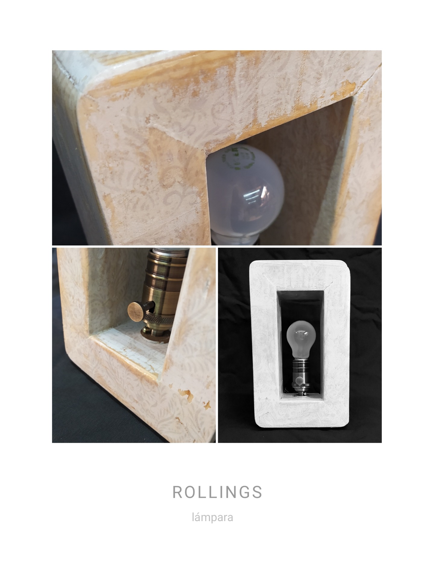 Redondeando los cantos hasta darle una forma y sensación suave y luego imprimir un motivo antiguo, con esto, más el portalámparas vintage y el cable que es un cordón rojo, hacen de ROLLINGS una lámpara singular